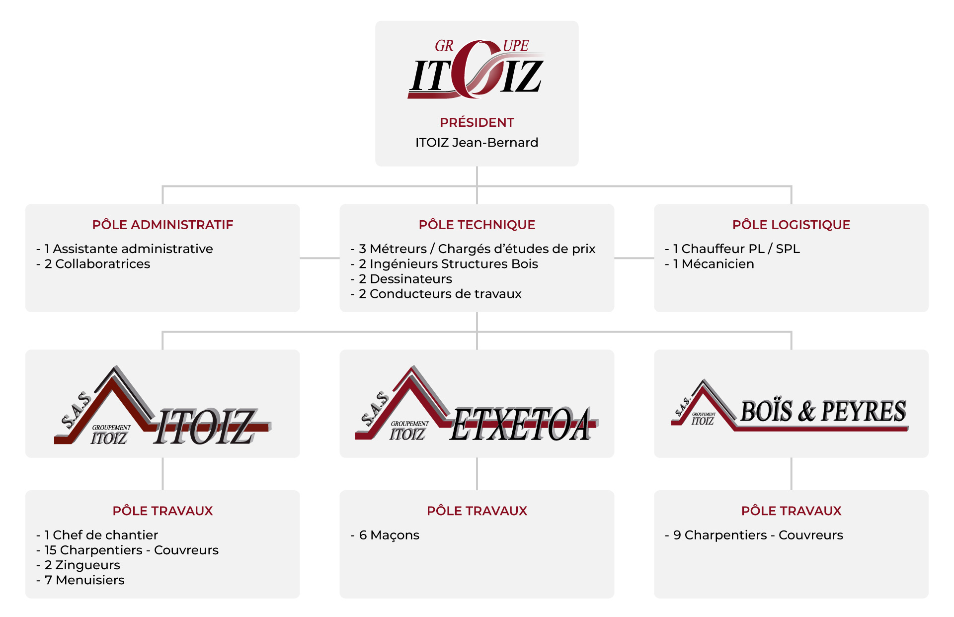 Le « Groupement Itoiz » a été créé par ITOIZ Beñat en 2020 dans le but de réunir 3 sociétés de bâtiments, à savoir : S.A.S. Itoiz, S.A.S. Itoiz-Etxetoa et S.A.S. Bois & Peyres. En y intégrant ce groupe, nos filiales bénéficient d’une équipe administrative et techniques communes leurs permettant à chacune d’entre elles d’assurer le bon fonctionnement des sociétés.